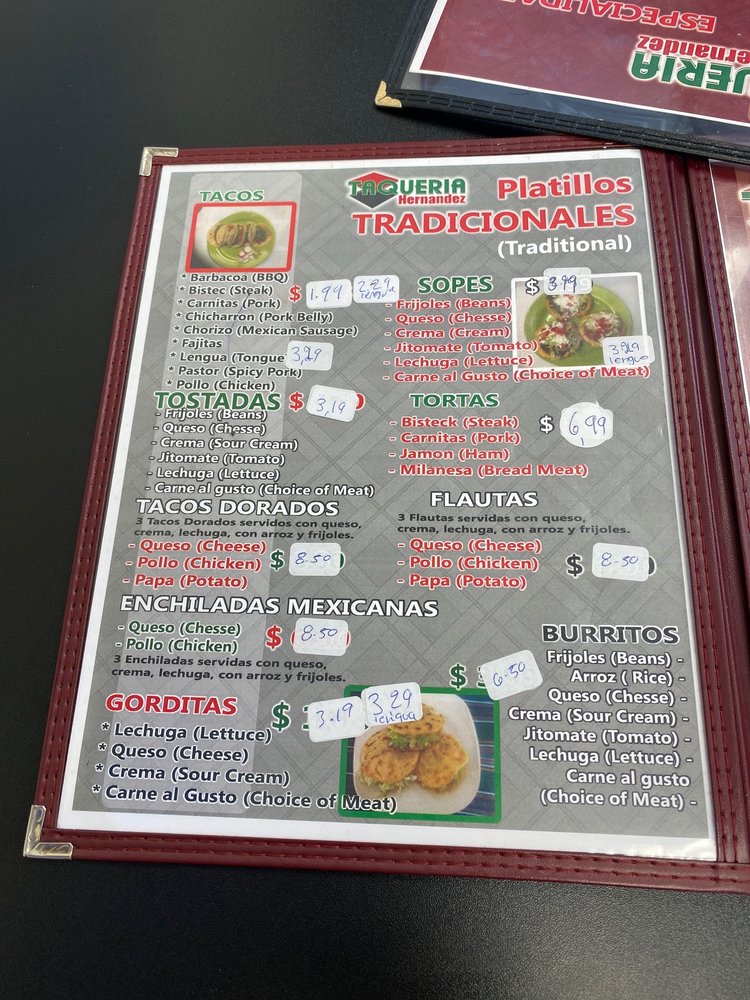 “ Great authentic tacos. Wonderfully priced. Warm tortillas. Great presentation. About 2.19 a taco. Highly preferred over gourmet tacos; these at taqueria Hernandez are fulfilling but I would say order 4+ if you're hungry fr fr. They have fruit too so I believe they double with a fruiteria. I haven't tried that yet. My new fav taco spot & I'll be back soon. I bought a jarritos, 7 tacos (chicken and bistec) & spent $20 ($16 before adding the jarrito). The food came up quick enough while I waited. I can't wait wait to go back. ”